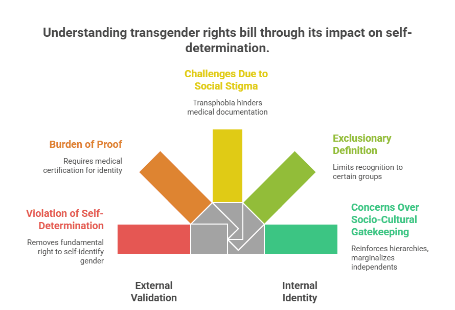 1. Erasure of Self-Identification: The Bill deletes the right to self-perceived gender identity. It directly contradicts the NALSA judgment. Trans men, trans women, and genderqueer individuals outside traditional categories are effectively removed from legal protection.